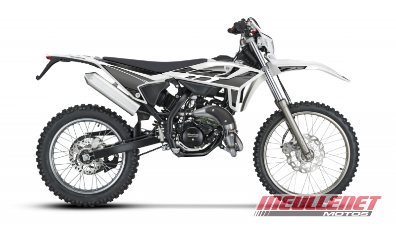 Moteur monocylindre 2 temps, 6 vitesses, refroidi par eau équipé d'un mélangeur d'huile (sauf RR 50 Racing). Boîte de vitesses avec de nouvelles fourchettes de sélection forgées : embrayage plus précis pour une conduite encore plus réactive et exaltante. Système de récupération des vapeurs d'essence conforme à la réglementation Euro 5. Partie intégrante de l'esthétique du véhicule, il est développé pour améliorer la maîtrise du bruit conformément aux réglementations en vigueur. Bras oscillant plus long pour une plus grande stabilité de conduite et une meilleure traction. Amortisseurs revus au niveau de la course pour les versions enduro et du tampons de butée pour les versions motard. Nouvel échappement : compact, racing, digne d'une vraie moto. Nouveau système de verrouillage simple. Une clé pour le verrouillage de la direction / du démarreur, réservoir et selle. Plus de praticité et de sécurité. Nouveau feu arrière à LED : améliore la sécurité et la visibilité du véhicule. Freins : avant à disque Ø 260 mm, arrière Ø 220 mm. Nouveau réservoir de 6,5 l